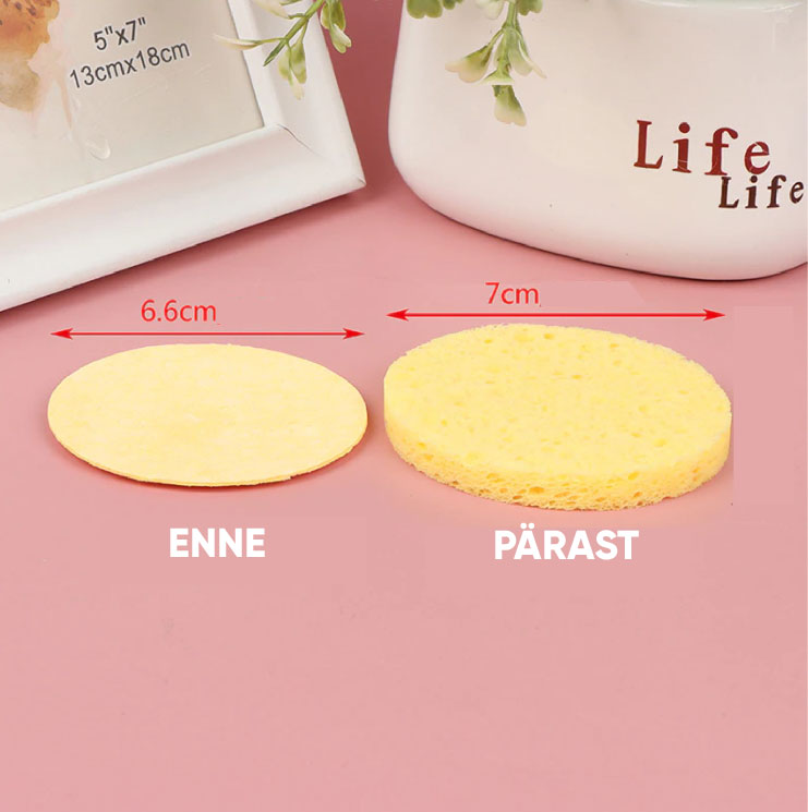 Kokkupressitud näopuhastuskäsnad paisuvad veega kokkupuutel. Sobivad tundlikule ja õrnale nahale igapäevaseks puhastamiseks.