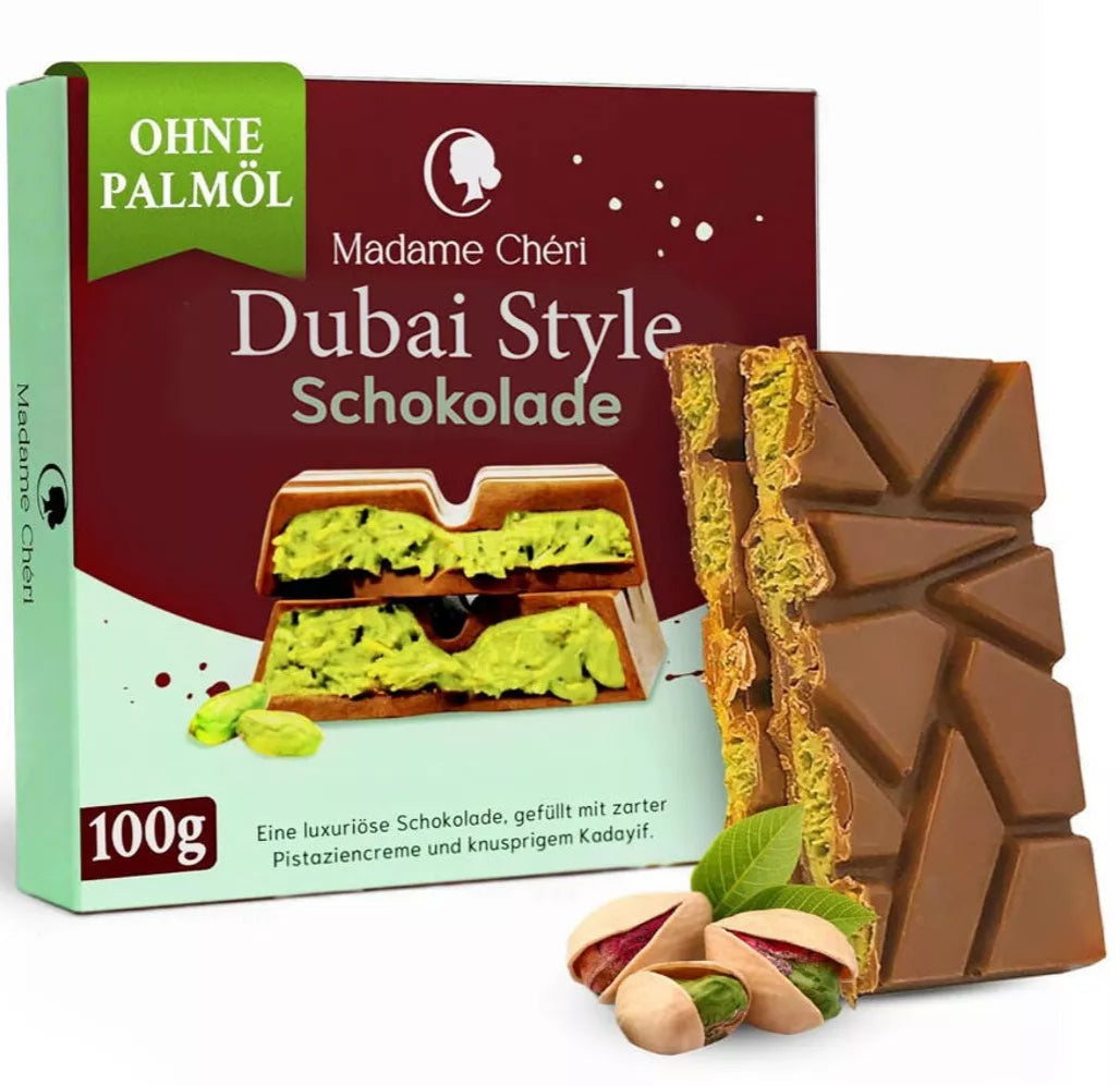 Eksklusiivne ja imemaitsev Dubai šokolaad Madame Chéri-lt. Käsitööna valmistatud piimašokolaad, mille südames peitub kreemjas pistaatsiakreem ja krõbe kadaif.