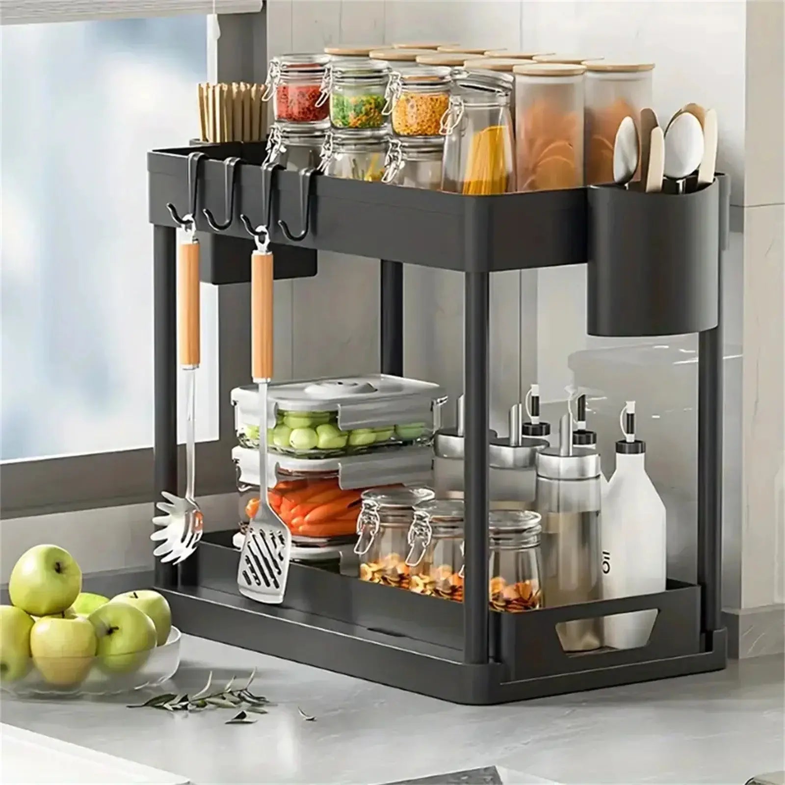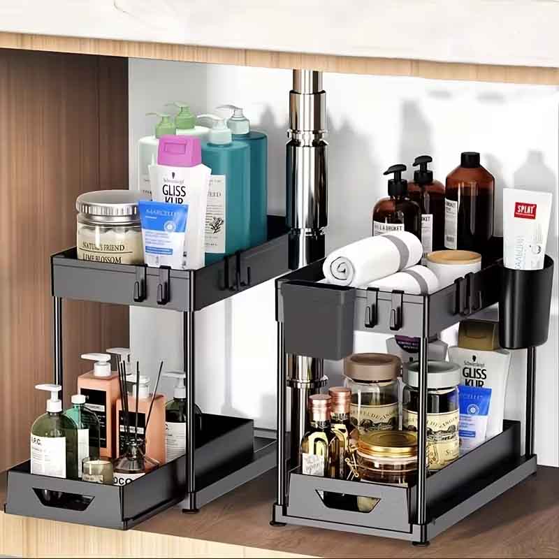 Kahe tasapinnalise riiuli abil saad tõhusalt ära kasutada pinda, kus ruumi napib. Ideaalne lahendus täiendava hoiustamisruumi tekitamiseks köögitarvikutele, puhastusvahenditele, toiduainetele ja muudele asjadele köögikappides, valamukappides ja vannitoas.